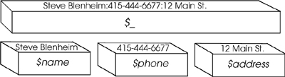 The special DATA filehandle gets its input from the text after the _ _DATA_ _ token. The while loop is entered and the first line after the _ _DATA_ _ token is read in and assigned to $_. Each time the loop is entered, the next line following _ _DATA_ _ is assigned to $_ until all the lines have been processed. Each line from the file will be split at the colons and the value returned stored in an anonymous list consisting of three scalars: $name, $phone, and $address. Using the anonymous list makes the program easier to read and manipulate than in the previous example where an array was used. With the array, you have to make sure you get the right index number to represent the various fields, whereas the named scalars are straightforward. The pattern /408-/ is matched against the $phone variable. If that pattern is matched in $phone, the value of $name is printed. Igor's name is printed because his phone matches the 408 area code. The text following _ _DATA_ _ is used as input by the special DATA filehandle.