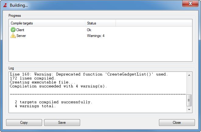 When the 'Build all Targets' menu entry is selected on an open project, all targets that have the corresponding option set in the compiler options will be compiled in the order they are defined in the compiler options. The progress window shows the current compile progress as well as the status of each target. When the process is finished, the build log can be copied to the clipboard or saved to disk.