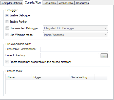 This section contains options that affect how the executable is run from the IDE for testing. Except for the tools option, they have no effect when the "Create executable" menu is used.Enable Debugger
