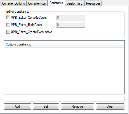 In this section, a set of special editor constants as well as custom constants can be defined which will be predefined when compiling this source.#PB_Editor_CompileCount