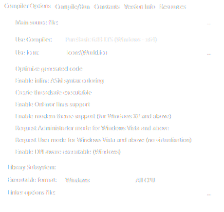 The right side of the compiler options is almost the same as in the non-project mode and reflects the settings for the compile target that is currently selected on the left. The only difference are the "Input source file" and "Output executable" fields on the first tab. These fields have to be specified for all compile targets. Other than that, the compiler options are identical to the options described above.