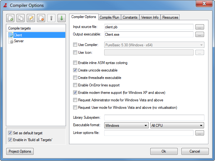The compiler options for projects allow the definition of multiple compile targets. Each target is basically a set of compiler options with a designated source file and output executable. The left side of the compiler options window is extended with the list of the defined compile targets. The toolbar on top of it allows to create, delete, copy, edit or move targets in the list.