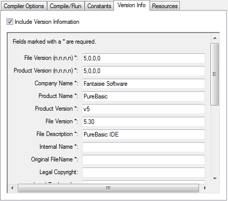 Fields marked with a * are required if you want to include the version info (if not all required fields are set, the information may not display correctly on some versions of Windows).