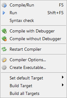 When a project is open, this submenu shows all compile targets and allows to quickly switch the current default target. The default target is the one which is compiled/executed with the "Compile/Run" menu entry.