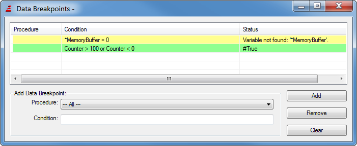Example conditions:MyVariable$ <> "Hello" Or Counter < 0 ; halt if MyVariable$ changes from "Hello" or if the Counter falls below zero PeekL(*SomeAddress+500) <> 0 ; halt if the long value at the given memory location is not equal to zeroData breakpoints can be added using the Data Breakpoint option from the Debugger menu. They can be limited to a specific procedure or they can be added for all code. The special "Main" entry of the procedure selection specifies that the data breakpoint should only be checked when the execution is not in any procedure.