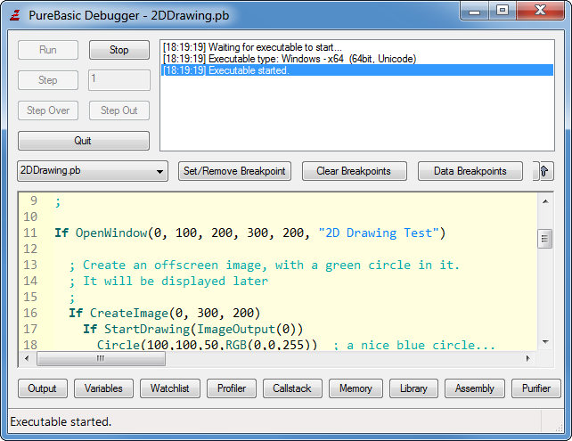 PureBasic provides a powerful debugger that helps you find mistakes and bugs in your source code. It lets you control the program execution, watch your variables, arrays or lists or display debug output of your programs. It also provides advanced features for assembly programmer to examine and modify the CPU registers or view the program stack, or the Memory of your program. It also provides the possibility to debug a program remotely over the network.The Debugger integrated into the IDE