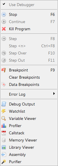 On the Debugger window, you have control buttons to carry out the basic program control, as described above. The "Step" button carries out as many steps as are set in the edit field next to it. Closing the Debugger with "Quit" or the close button will also kill the debugged program.