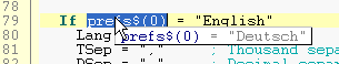 The value of a variable can be very quickly viewed while the program is running by placing the mouse cursor over a variable in the source code and waiting for a brief moment. If the variable is currently in scope and can be displayed, its value will be shown as a tool-tip on the mouse location.More complex expressions (for example array fields) can be viewed by selecting them with the mouse and placing the mouse cursor over the selection.