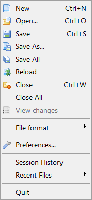 The file menu allows you to do basic file operations like opening and saving source codes.Contents of the "File" menu:
