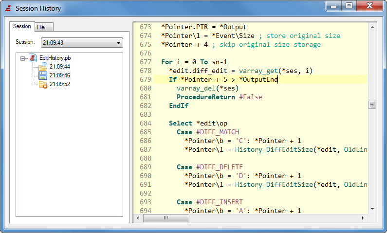 Session history is a powerful tool which regularly records changes made to any files in a database. A session is created when the IDE launch, and is closed when the IDE quits. This is useful to rollback to a previous version of a file, or to find back a deleted or corrupted file. It's like source backup tool, limited in time (by default one month of recording). It's not aimed to replace a real source code version control system like SVN or GIT. It's complementary to have finer change trace. The source code will be stored without encryption, so if you are working on sensitive source code, be sure to have this database file in a secure location, or disable this feature. To configure the session history tool, see preferences.