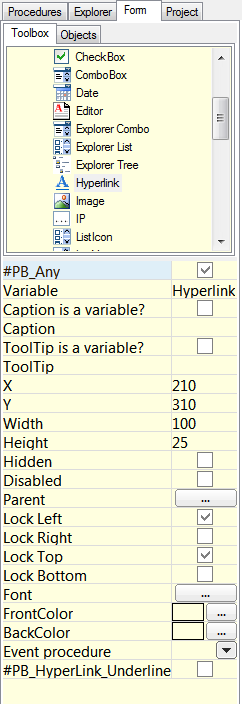 This panel list all available gadgets. Select one, and draw directly on the form the size needed. When a gadget is selected on the form, its properties are display on this panel and can be modified here.